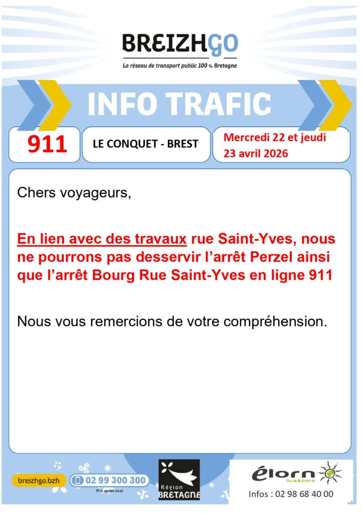 Pour rester informé des perturbations et déviations sur votre trajet, vous pouvez vous inscrire gratuitement aux alertes Breizhgo. En effet, Elorn Bus et Cars assure le transport de la Ligne 911.