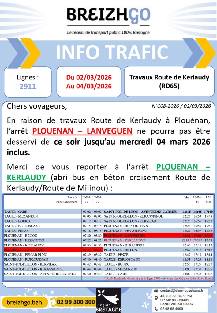 Chers usagers de la ligne 2911, en raison de travaux Route de Kerlaudy à Plouénan, l’arrêt PLOUENAN – LANVEGUEN ne pourra pas être desservi de ce soir jusqu’au mercredi 04 mars 2026 inclus. Merci de vous reporter à l’arrêt PLOUENAN – KERLAUDY (abri bus en béton croisement Route de Kerlaudy/Route de Milinou).