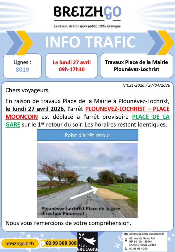 Chez voyageurs, en raison de travaux Place de la Mairie à Plounévez-Lochrist, le lundi 27 avril 2026, l’arrêt PLOUNEVEZ-LOCHRIST – PLACE MOONCOIN est déplacé à l’arrêt provisoire PLACE DE LA GARE sur le 1er retour ce soir. Les horaires restent identiques.