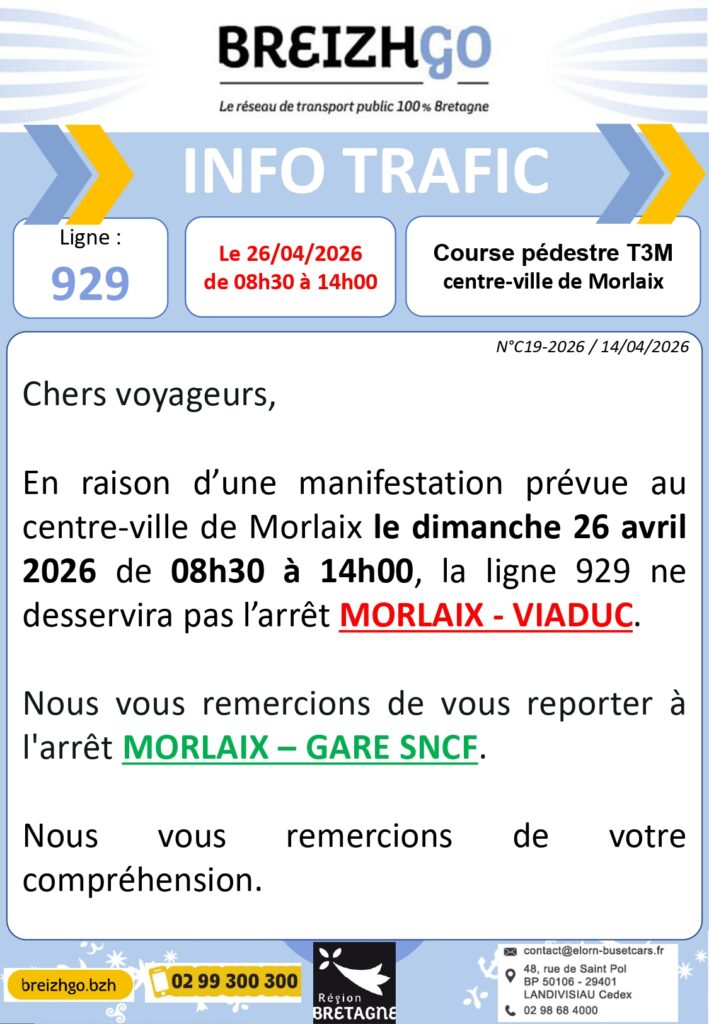 Chers voyageurs, en raison d’une manifestation prévue au centre-ville de Morlaix le dimanche 26 avril